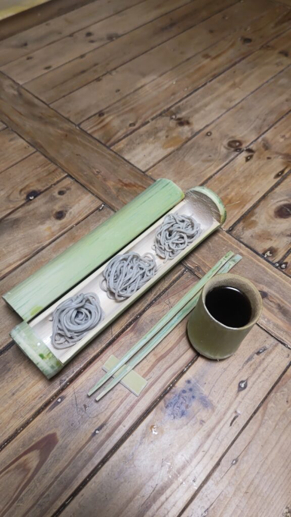 蕎麦を打ち、竹の器に入れてみた