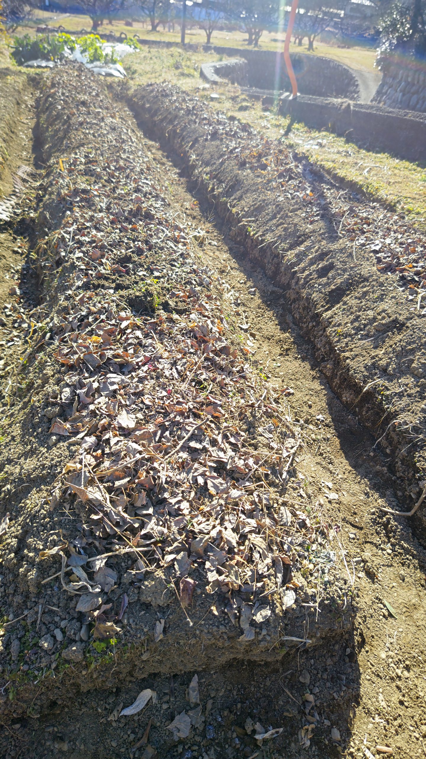 昨日作った2つの畝の上に、自宅の敷地内から集めてきた枯れ葉や小枝を上に乗せた。