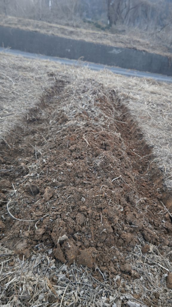 土は粘土、ツルや木の根、大きめの石があり、畝作りはすごく体力を消耗する。