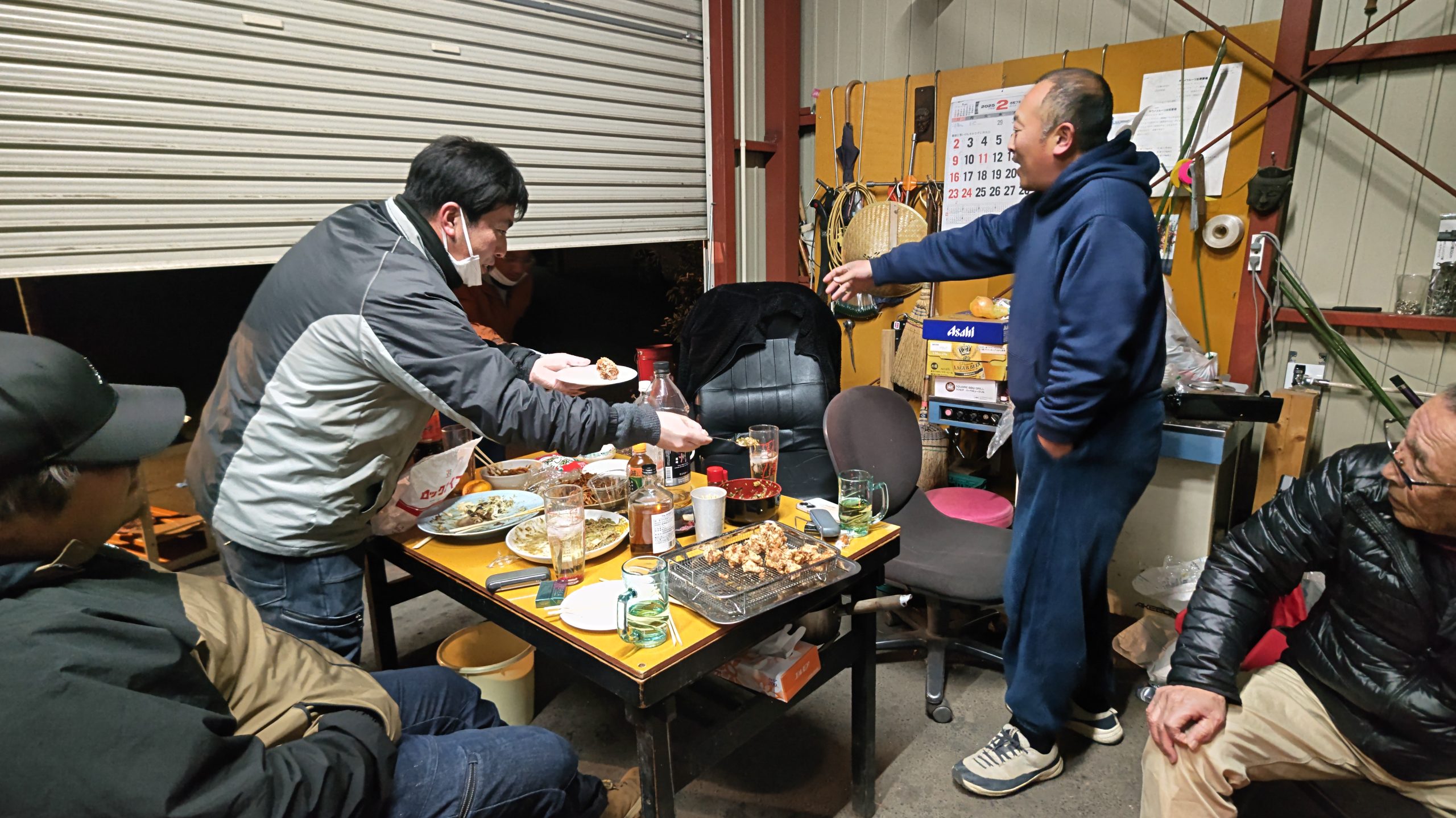 車庫が宴会場になり、料理は外で作っている。