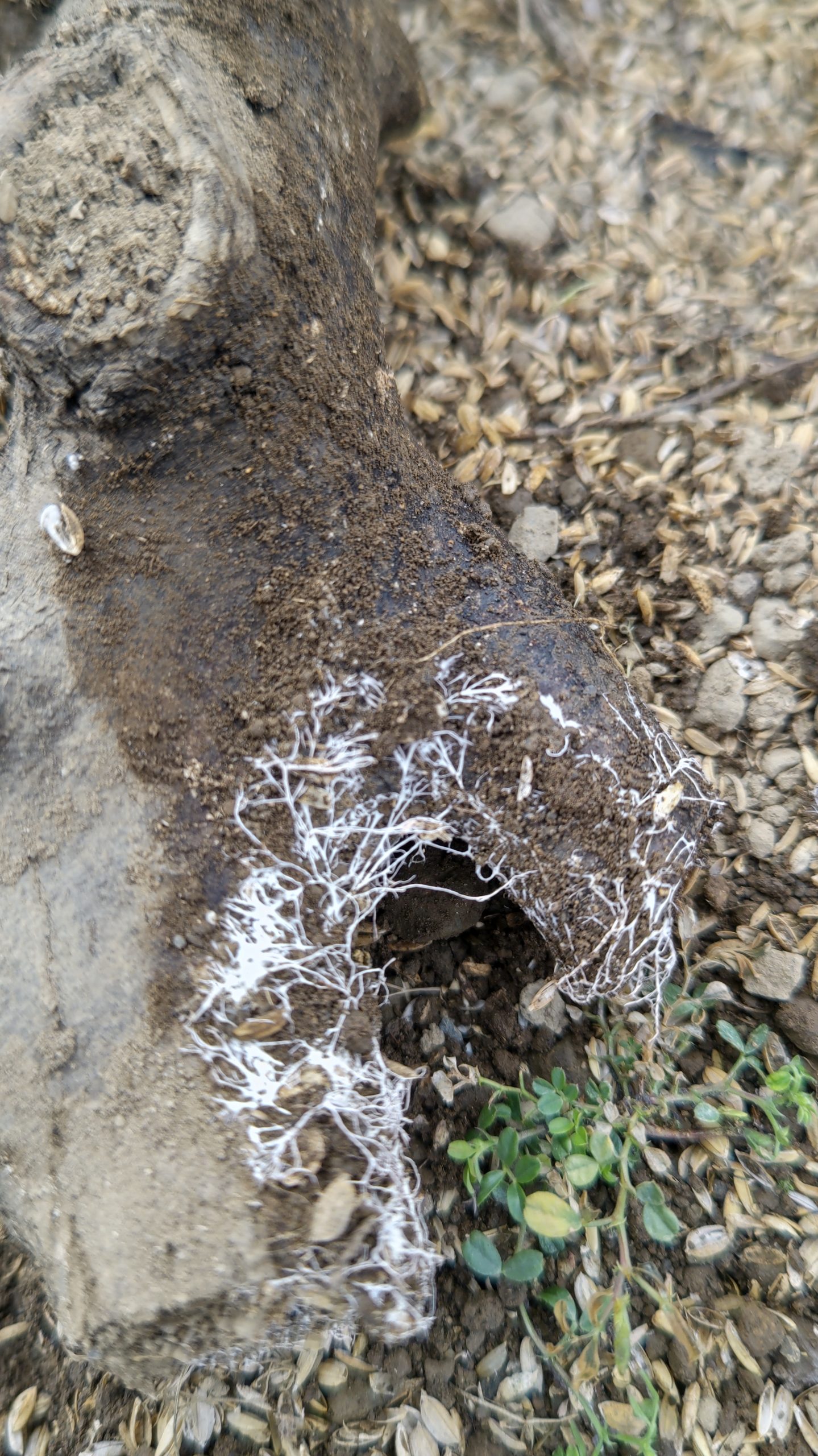 土を掘り返してみると、埋めていた木の一部分に糸状菌が成長していた。
