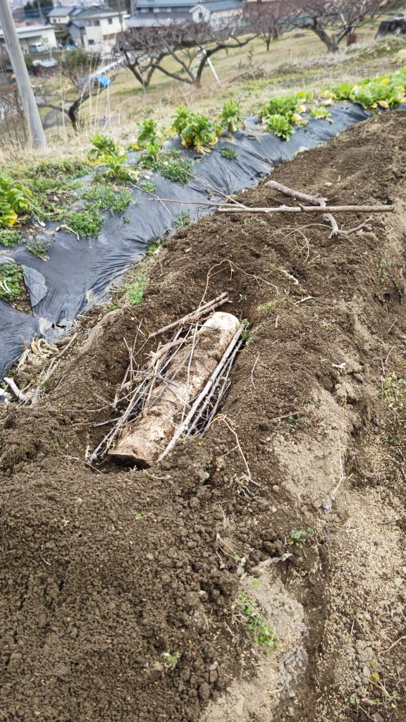 長持ちさせるためには中央に太い丸太を埋める必要性を感じて、丸太を埋めていった。