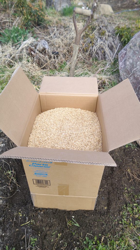 ウドをいただいたご近所から段ボールをもらい、精米所からもみ殻をもらい囲いを作ることにした。