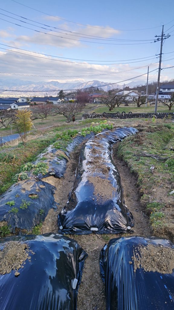 1本はまだ収穫中で、もう1本は畝が崩れてきていたので補修作業を行い、マルチ張りを行った。