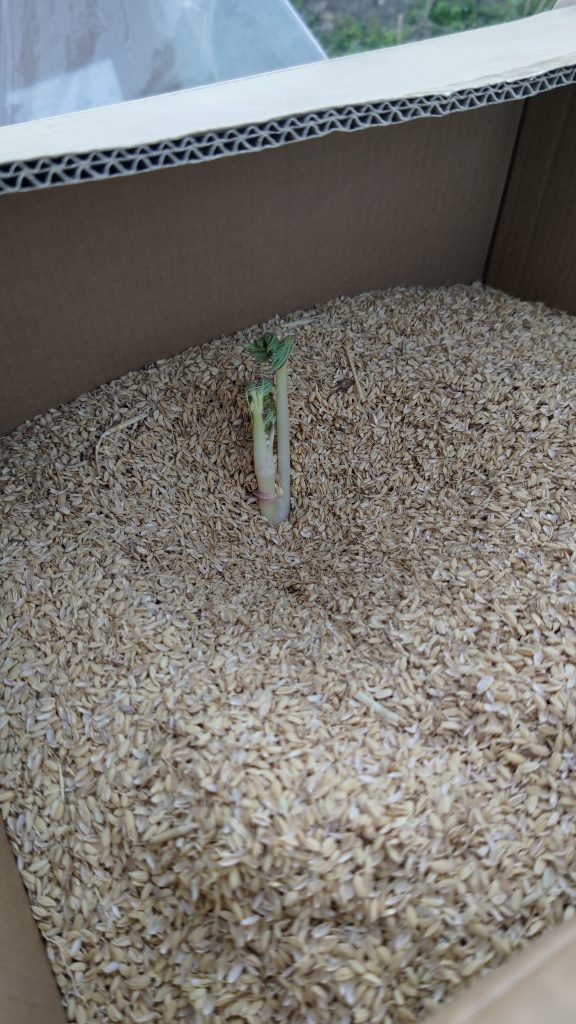 ご近所の人から株分けしてもらったウド、ダンボール箱を被せ中にびっしりともみ殻を入れておいた。 高さ的には50cmぐらいはあるだろう。もみ殻から出てきたら長さ50cmほどのウドが収穫できるのだ。 3月20日に被せたので、15日経過している。...