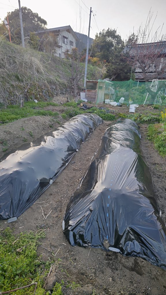 じゃがいもを植えた畝の手直しをして、2本マルチをかけることが出来た。