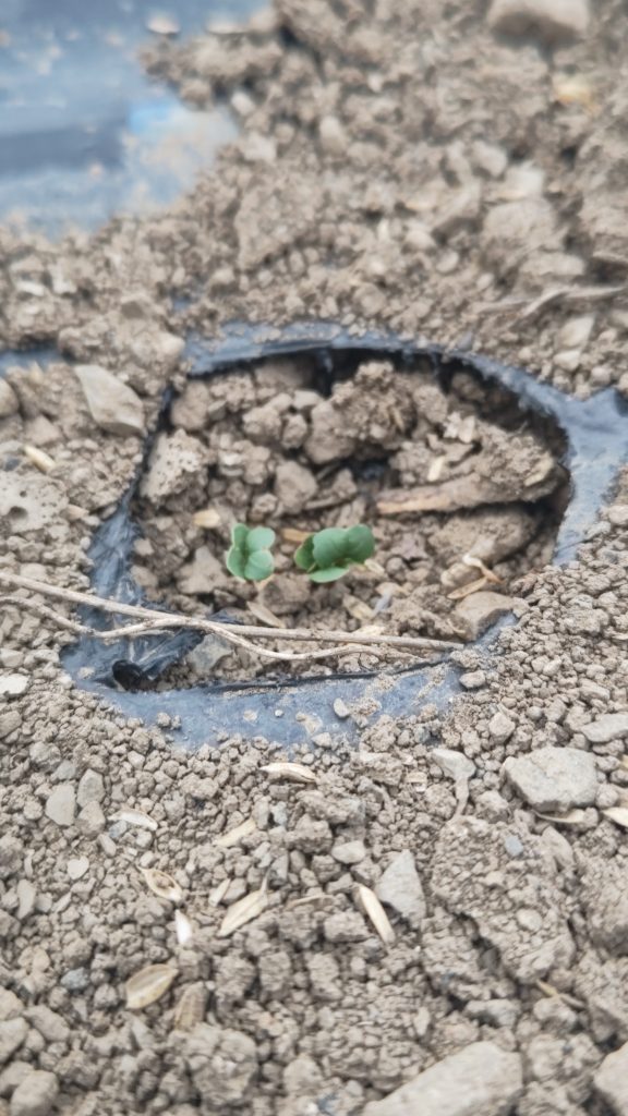 マルチを張ったところに直接撒いた種、芽が出てきている。