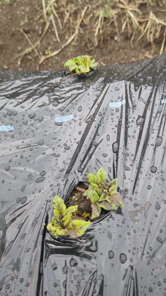じゃがいもの芽がマルチを押し上げてきたので、裂いて芽を出す作業を行った。