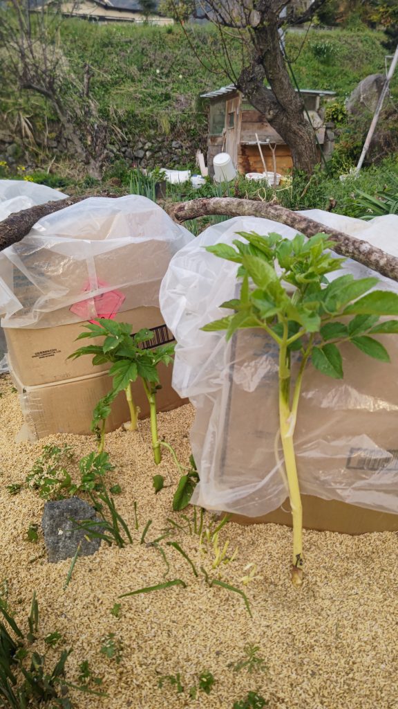 昨年の秋に収穫できていなかったじゃがいもが芽を出していて、レタスと一緒に成長している。