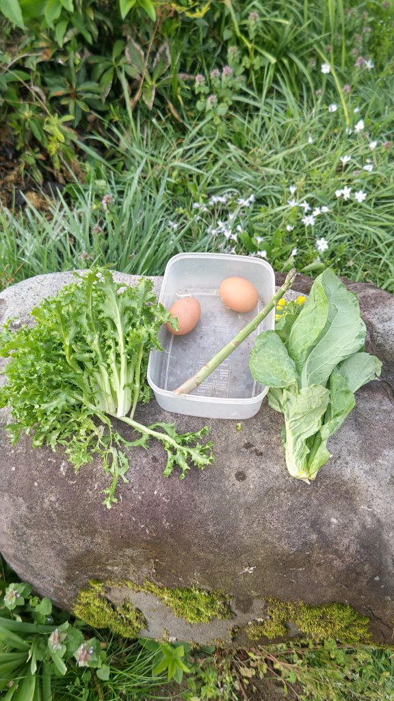 養鶏の卵、サラダ菜、アスパラ、白菜を朝収穫した。