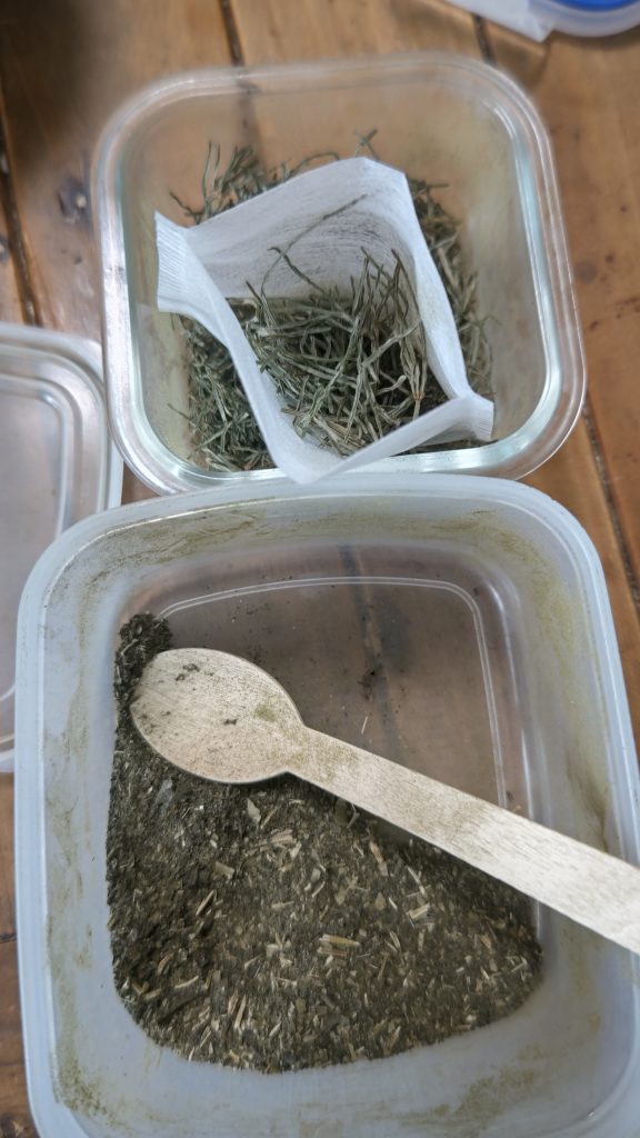 市販品の複種類の薬草茶が入った乾燥茶を購入し、それ以外に自宅で採れる柿の葉、スギナ、松の葉などを乾燥させてお茶にして飲んでいる。