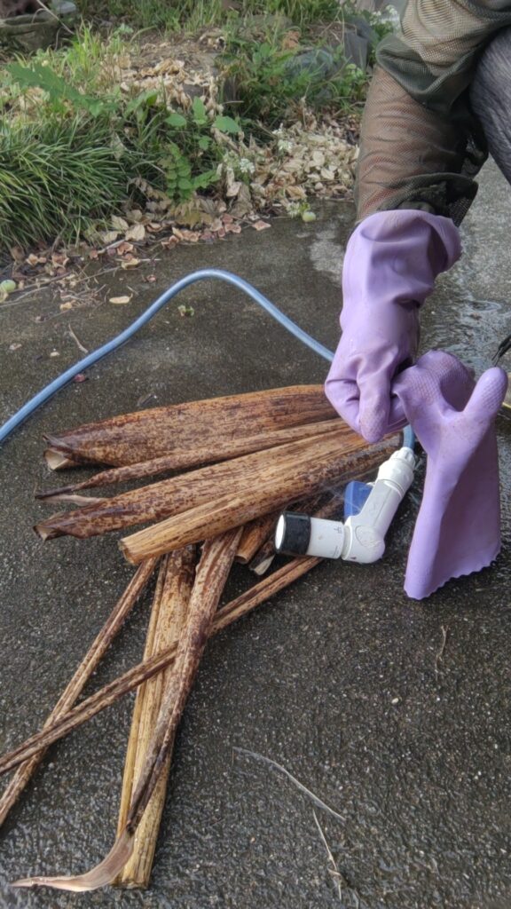 拾ってきた竹の皮、丸まっているのが多いので、洗って伸ばす作業が必要になる。