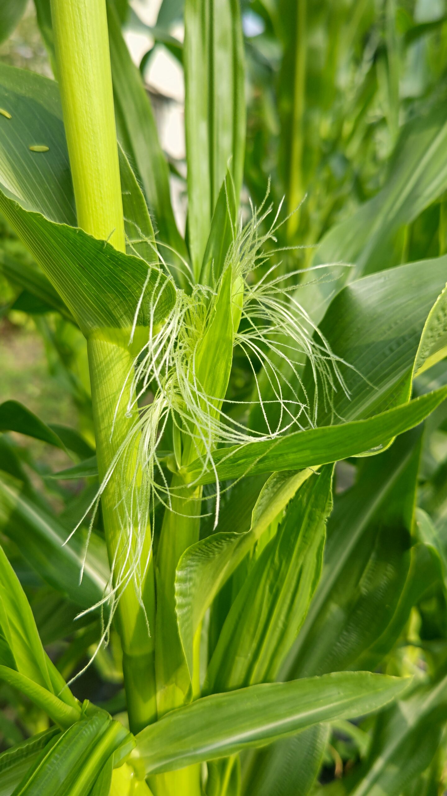 固定種のトウモロコシ、今年も1本は種を採取するために取っておく必要がある。