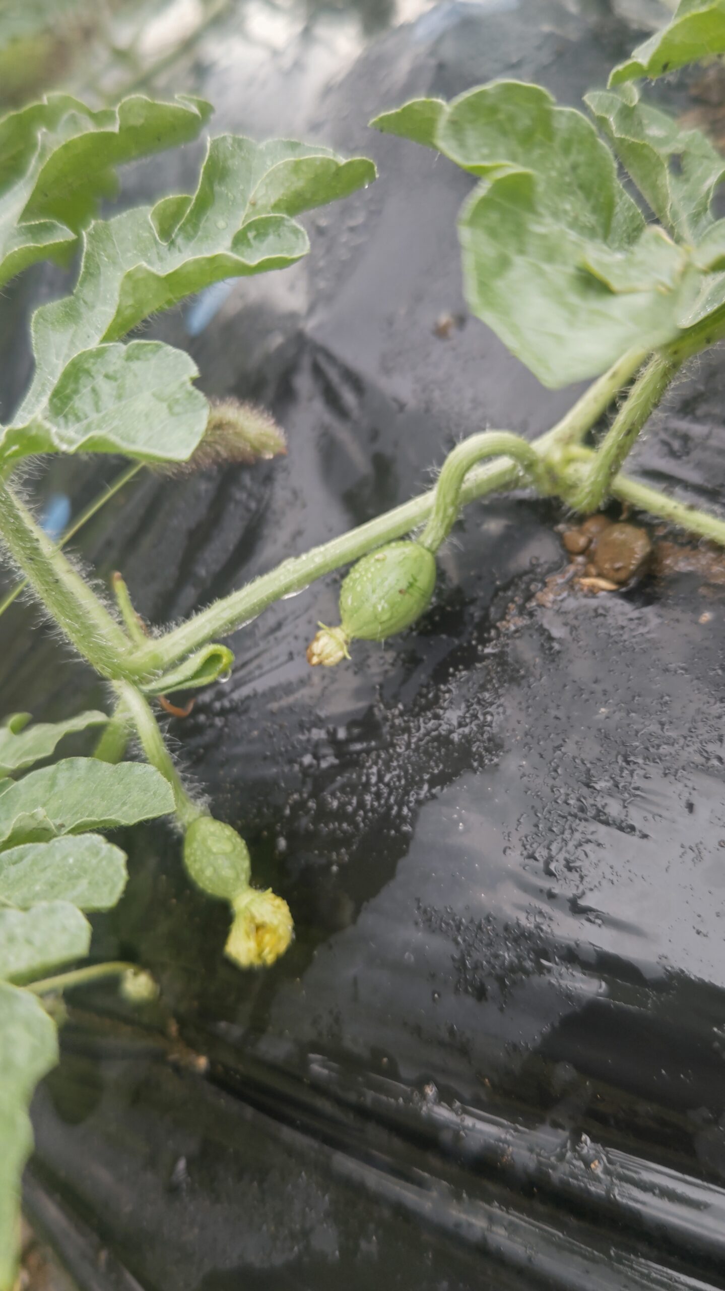 順調に芽が出て育ち、スイカの花が咲いて実がつきはじめてきた。