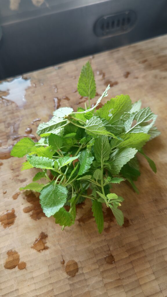 自家製のレモンバームの葉を採取して、洗ってお湯で2分ほど置いておく。