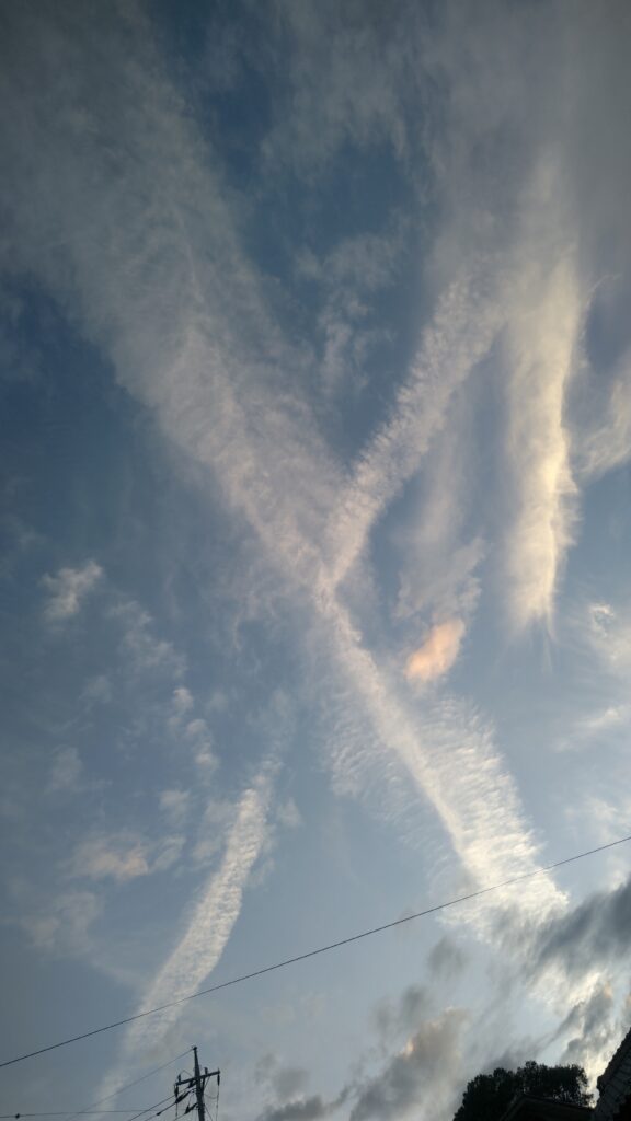 飛行機雲であれば交差しないだろうと思うが、不思議なXの雲が上空真上に見える。