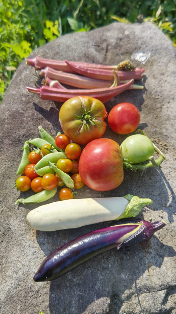 毎日収穫できる複数の野菜、自然農法的な菌ちゃん農法で育てているので、農薬、化学肥料など使用していない。