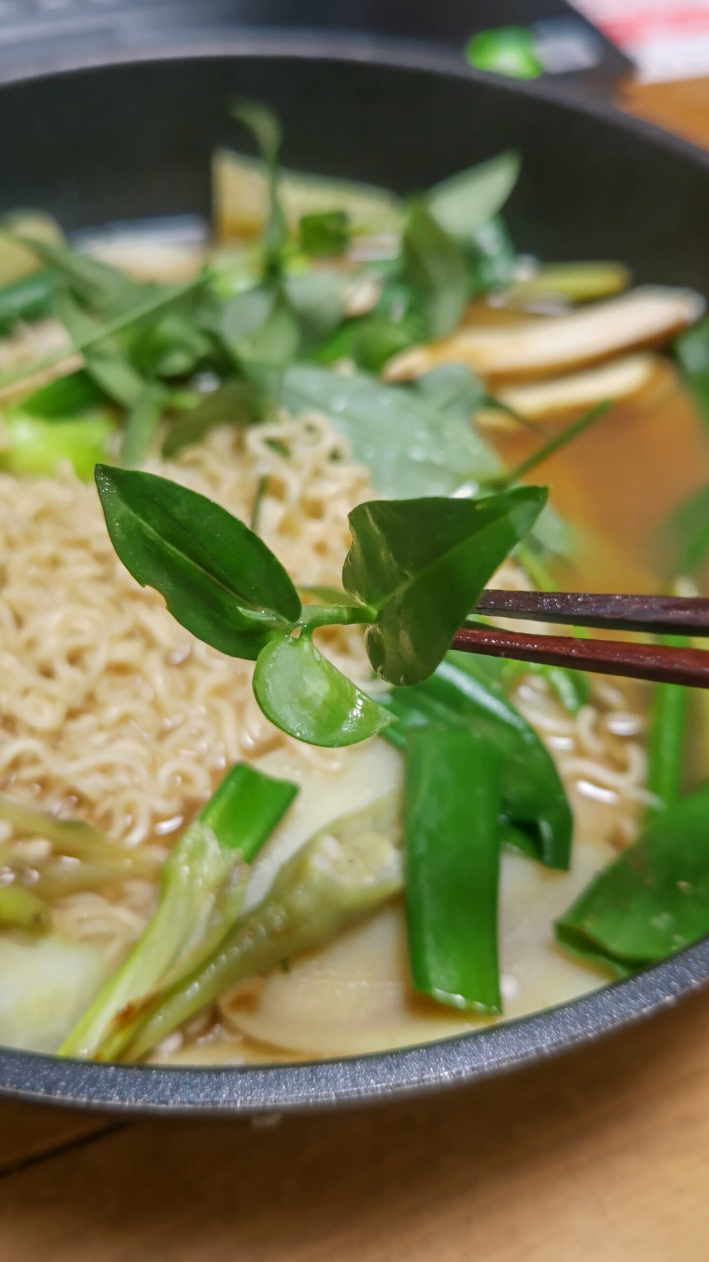 夕食はラーメンを食べることにしたので、ツユクサを採取して生で食べてみることにした。