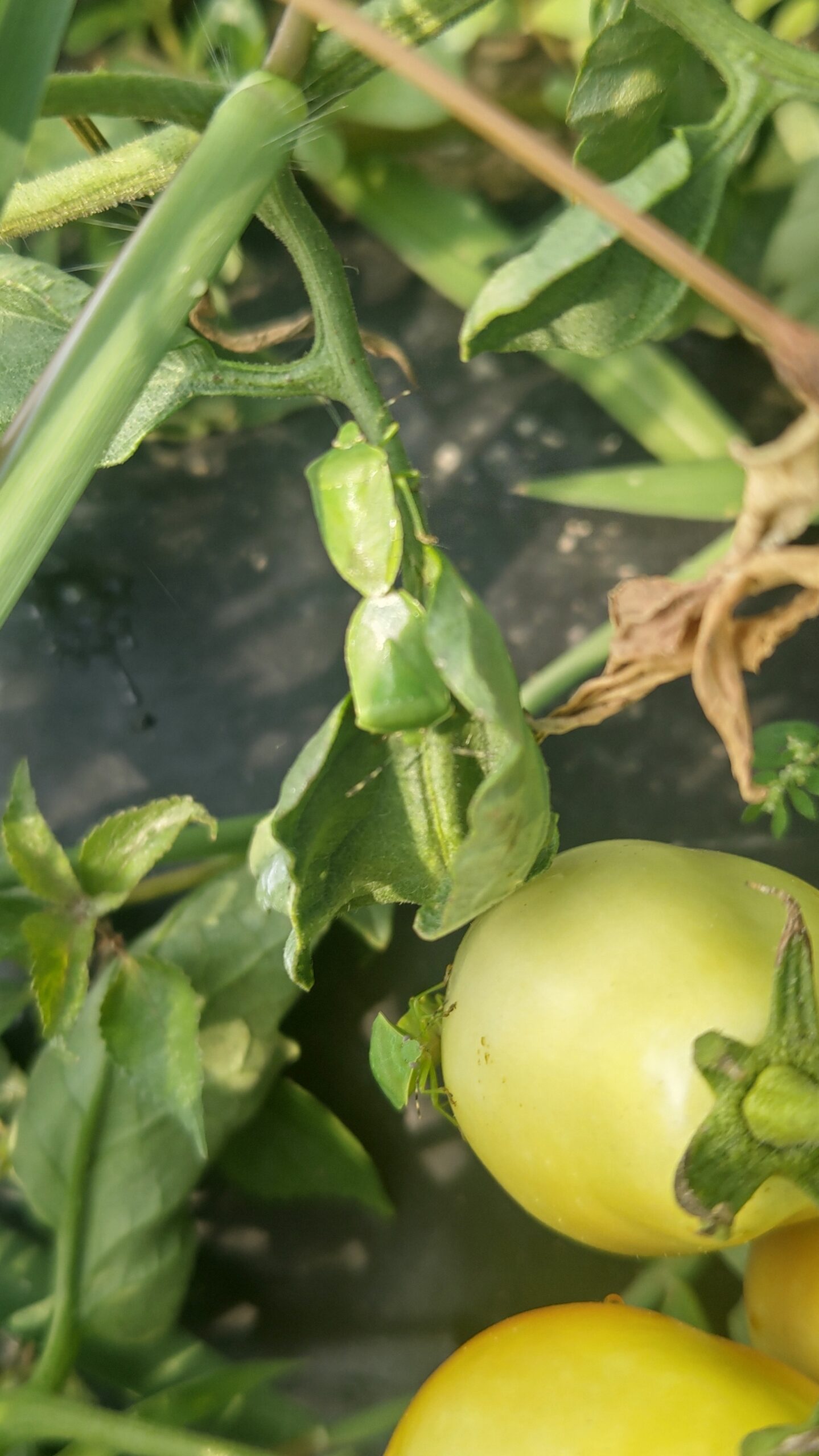今ある野菜はトマト、ナス、ピーマン、オクラが多いが、カメムシはこれらの野菜は大好きなようで、汁を吸われると腐敗、変形になる。