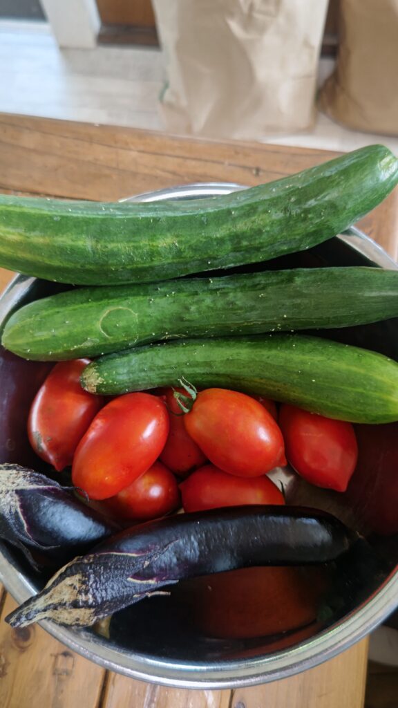 キュウリは相変わらず沢山実っていて、食べるのが追いつかない状態で、野菜室に沢山置いてある。