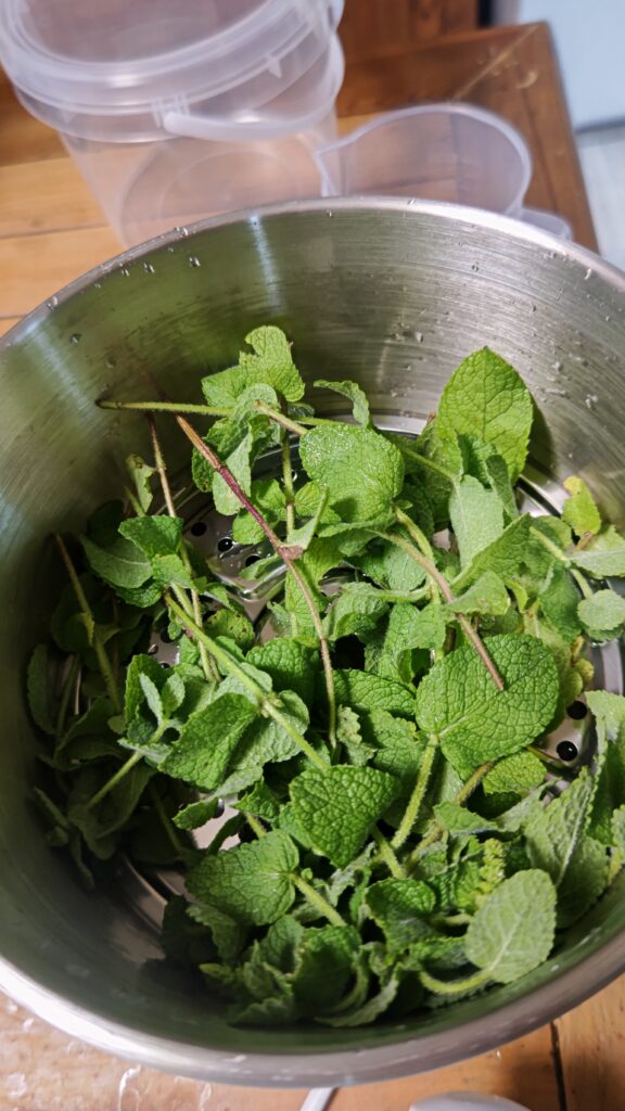 4回目も1.5リットルの水を入れて、畑ののり面に沢山生えているスペアミントを入れた。