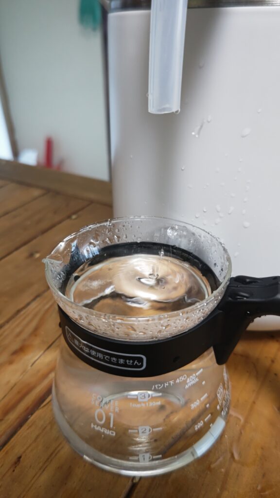 1.5リットルの水を入れて、60分で500ccほどの蒸留水ができるので、それを3回作ると飲料できる蒸留水ができるようになる。
