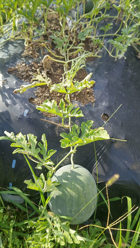 スイカは大きくなっておらず小ぶりサイズ、これ以上は大きくならないかも、食べられるかなぁ、、、、