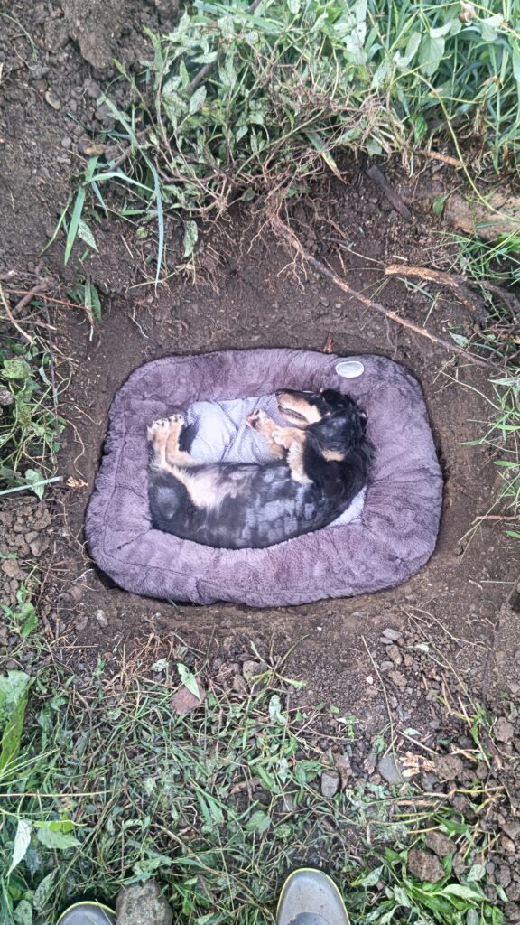 翌朝、梅の木の横に穴を掘り、マットを敷いてサミーを乗せて埋めた。