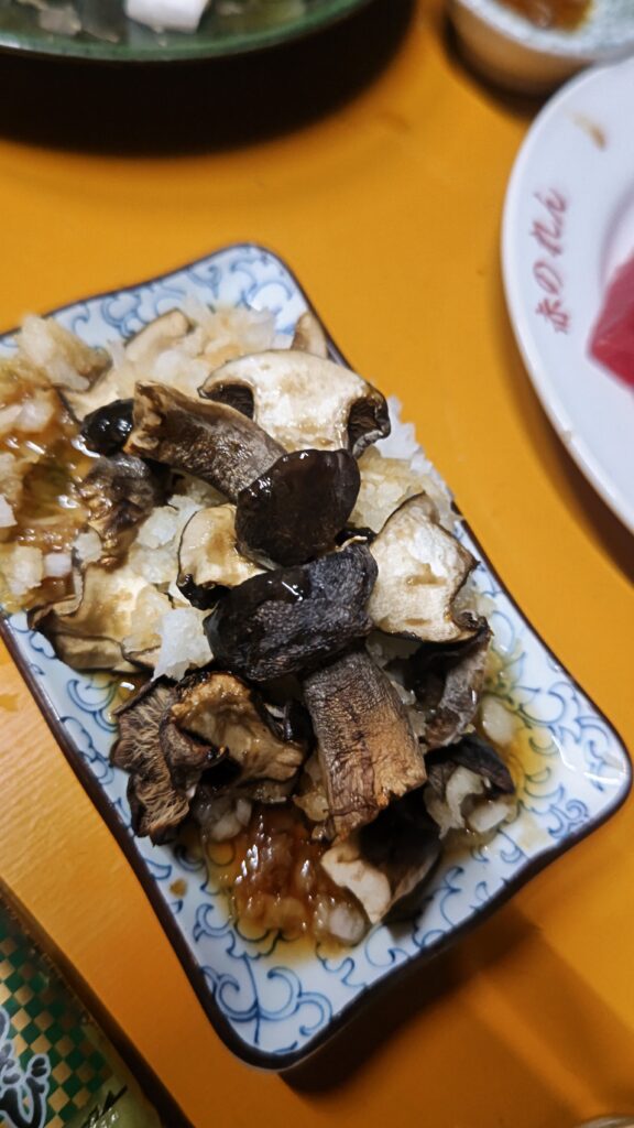 酒を飲みながらキノコを食べ、他にもサバ、豚肉などあり、夕食を食べなくてもお腹が膨れた。