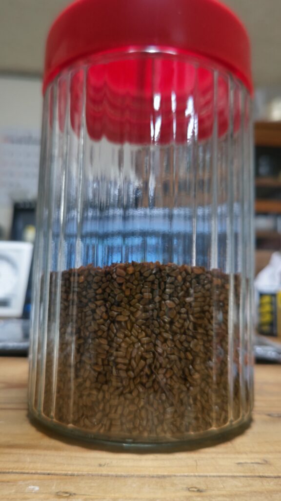 まだ緑色のサヤは半分以上ありそうなので、全ての種を採取したらこの瓶が満タンになりそうだ。