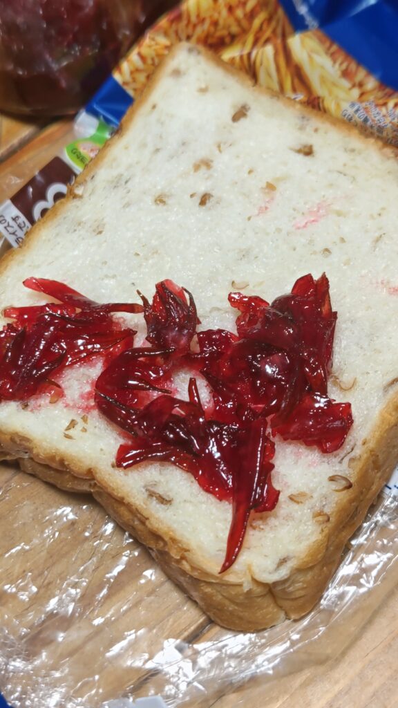 市販品だけれど食パンを購入して、ローゼルジャムを付けて食べてみた。