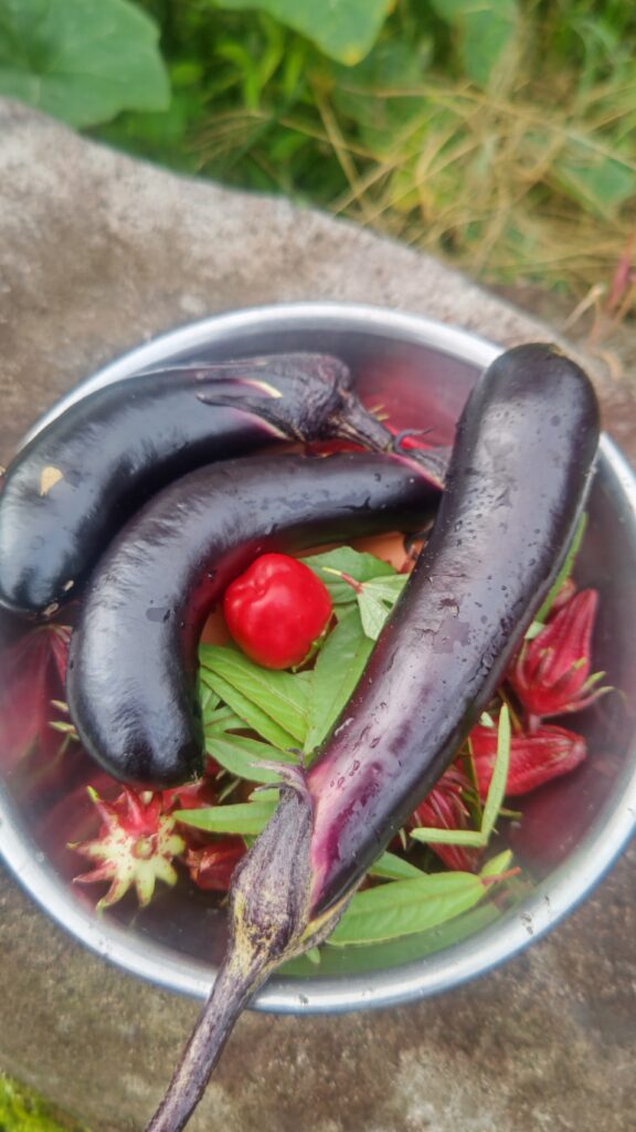 ナスが大きくなっていたので収穫、ローゼルのガク、葉、下には5個の卵がある。
