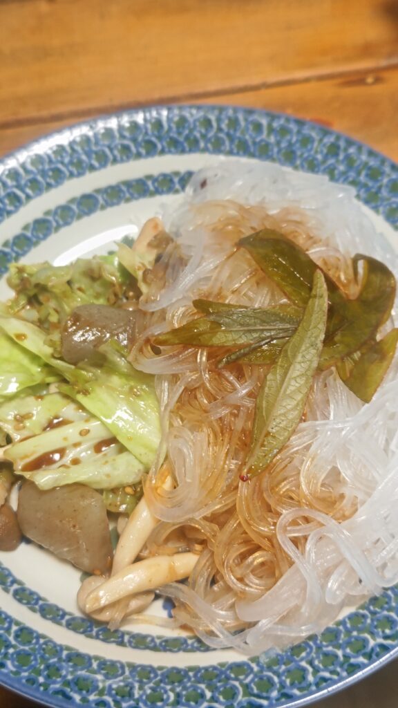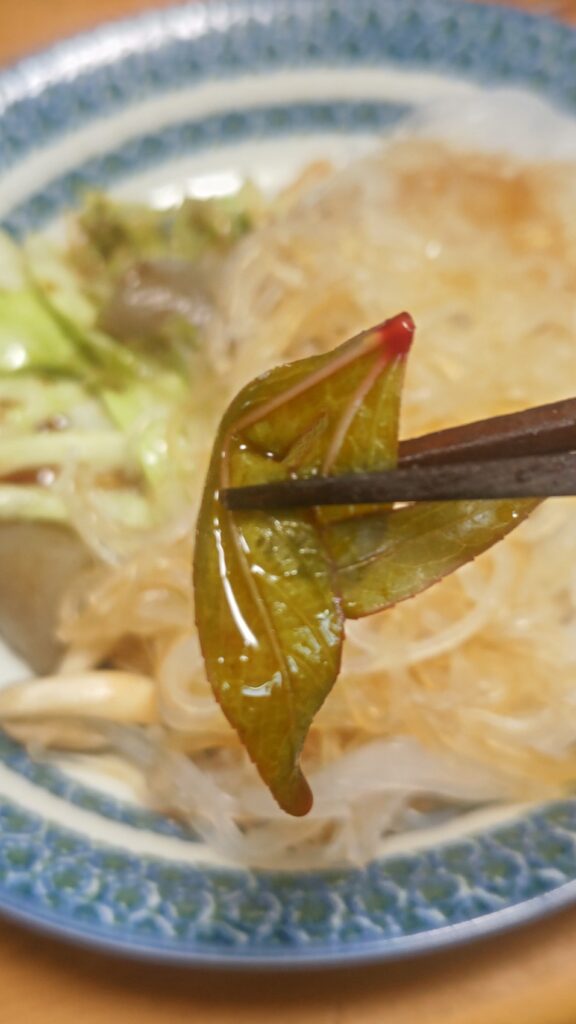 春雨を茹でた時に茹で終わった時に、ローゼルを葉を入れてすぐに取り出した。