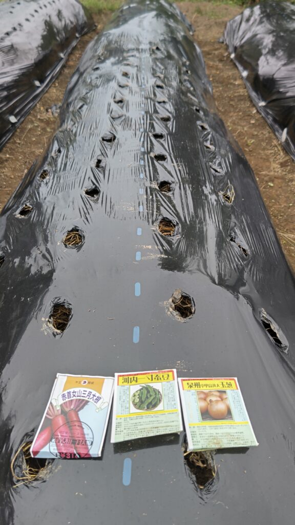 今回購入した固定種は、「赤首女山三月大根」「河内一寸蚕豆」「泉州中甲高黄大玉ねぎ」