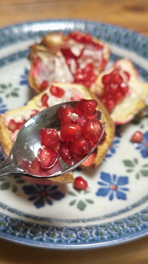 ザクロは種の周りの実?のような物を、食べるというより味わっていたけれど、後で分かったが種も一緒に食べられるということだった。