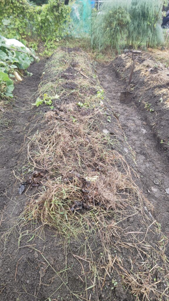 あと2本の畝があるが、春に収穫漏れしていたじゃがいもの苗が出てきているので、それを収穫したら残りの2本も畝を修復しようと思う。