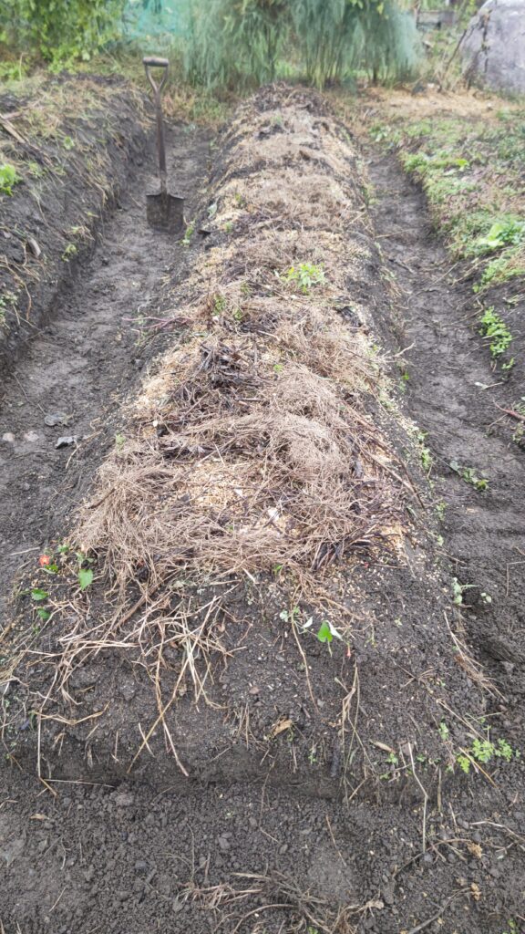 枯れ草を上に乗せて、理想的な畝になった。