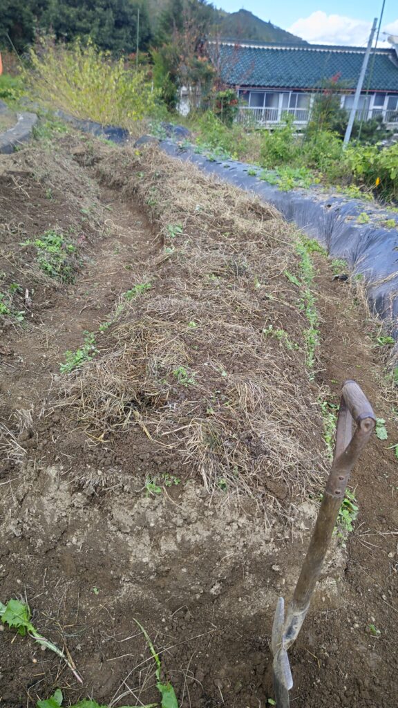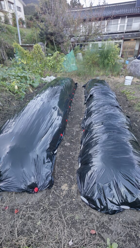 高畝を作るのですが、畝の中には選定した木、竹、籾殻などを埋め、畝の上には枯れ葉、草刈りした時の乾燥した草を畝の上に置いてマルチをかけます。