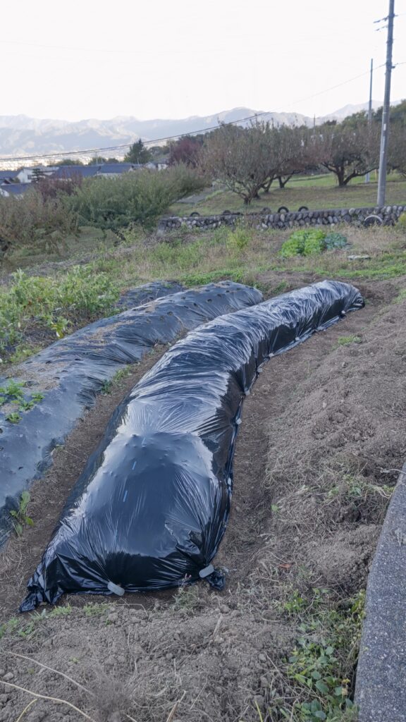 昨日2本修復した畝にもマルチを張った。