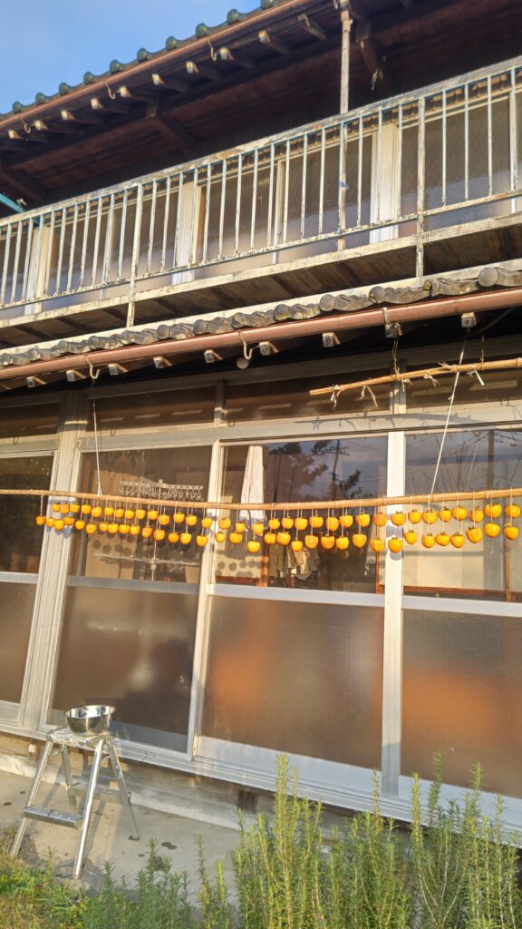 朝日に照らされながら、古民家の軒先にずらりと並ぶ柿のオレンジ色。その光景は、もう日本の原風景そのもの。
