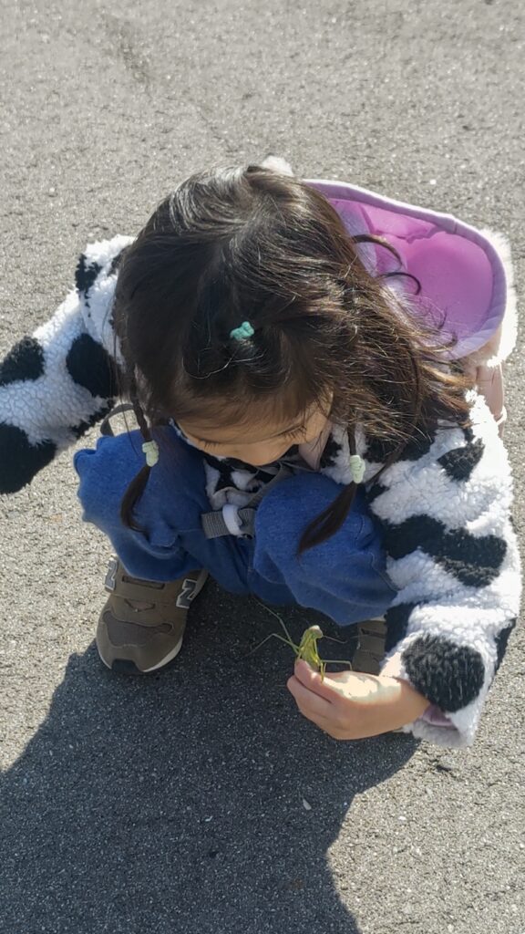 大きなカマキリを見つけて、孫はカマキリを捕まえるのに必死だった。