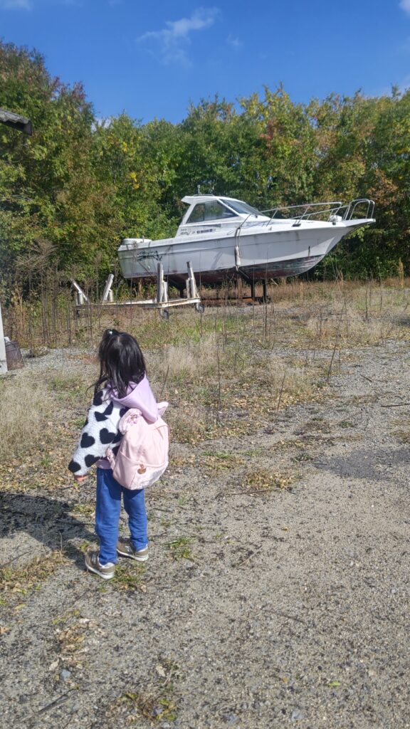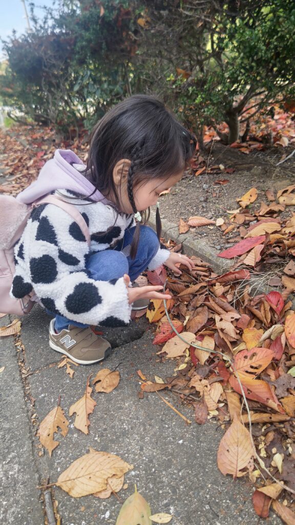 港の近くで枯れ葉と遊ぶ孫、枯れ葉を上に投げてヒラヒラと落ちてくるのが楽しいようだ。