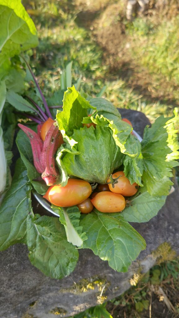 小松菜、大根、プチトマト、ローマトマト、ナス、そして卵も収穫、、、