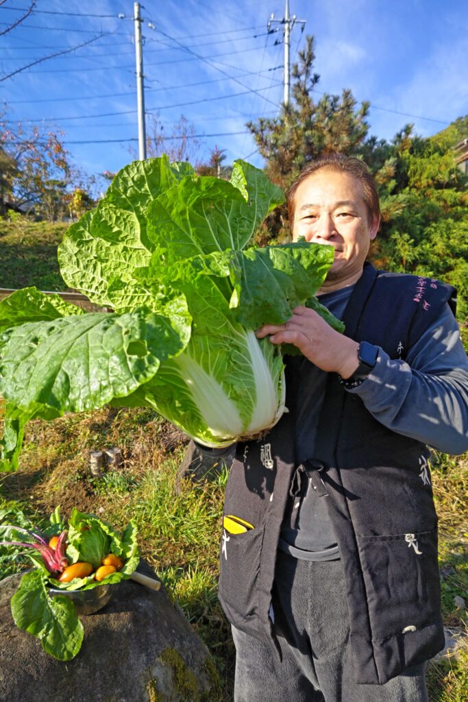 こちらからの手土産は、採れたての卵と大きな白菜だ。