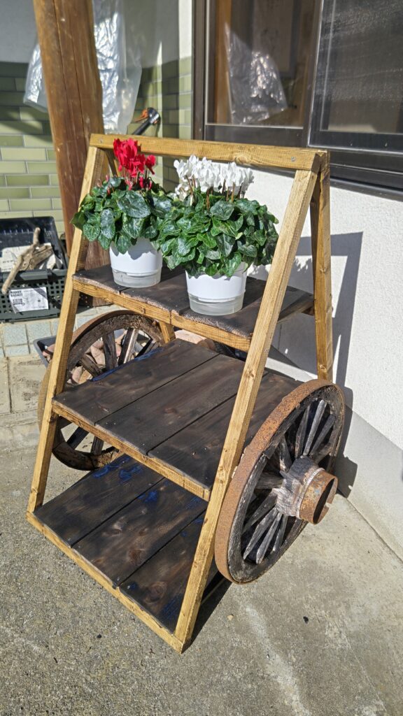 3年越しの夢が実現!助っ人と作った、木の車輪がお洒落なプランター