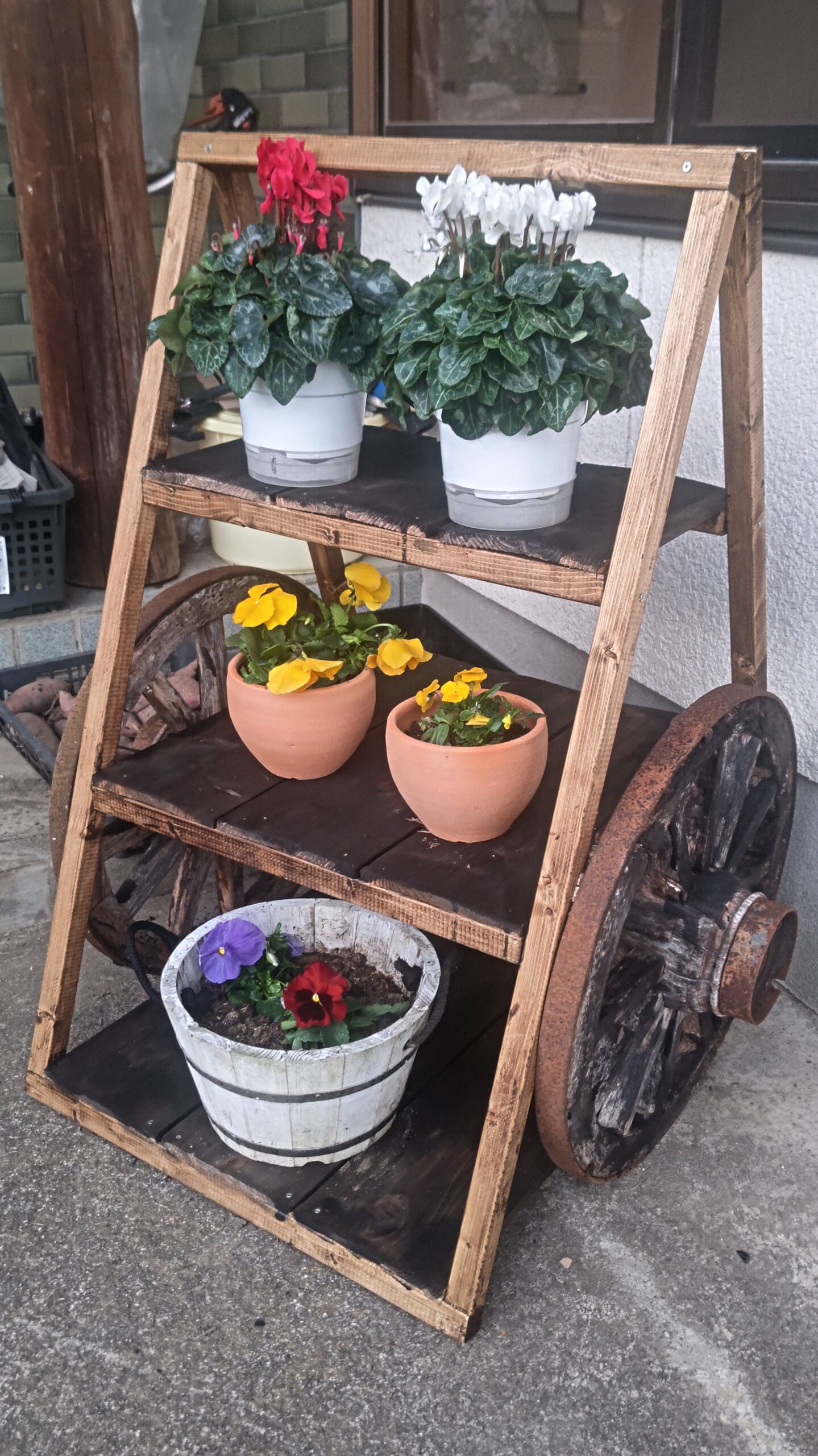 木の車輪を活かした、とってもオシャレで雰囲気のあるプランターが玄関先に誕生した!