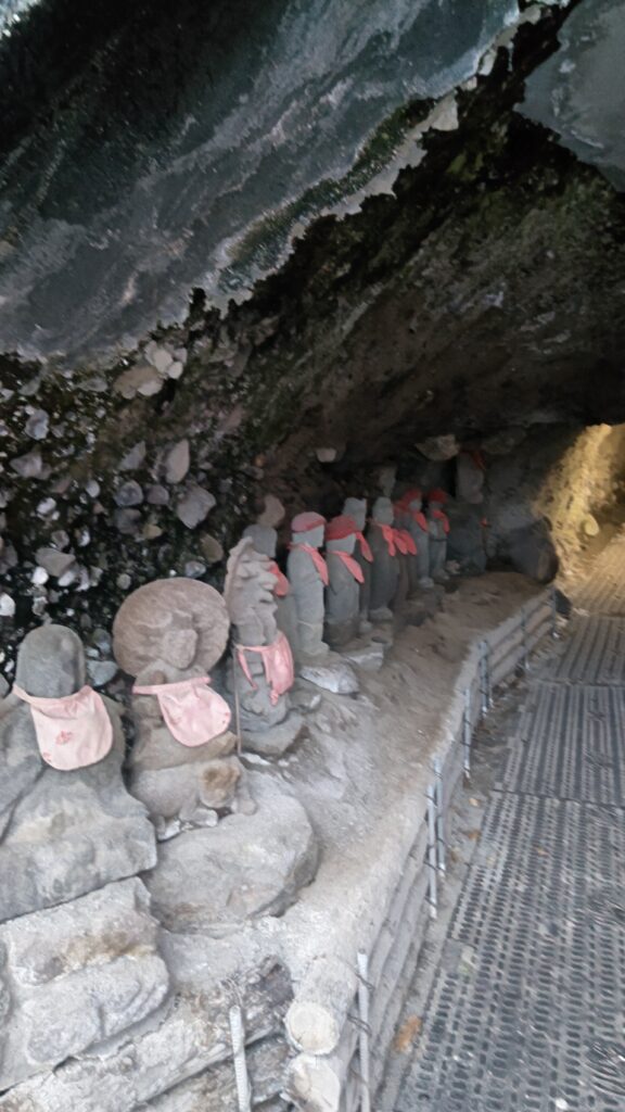 洞窟が2本あって、崖の途中には石仏を置くための穴が掘られてる。