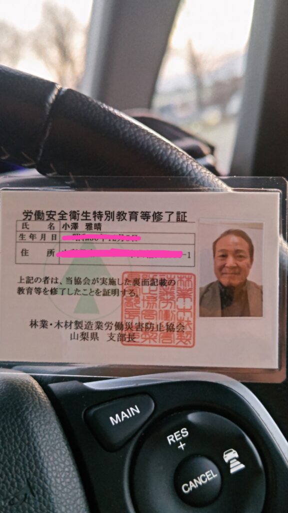 これで山林作業のときに、講習を受けた人だけができる切り方ができる。