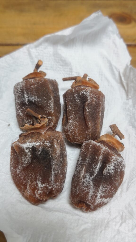 干し柿作りは、白い粉を吹く状態に出来るようになり、1日1日を粉の量が増えていっている。