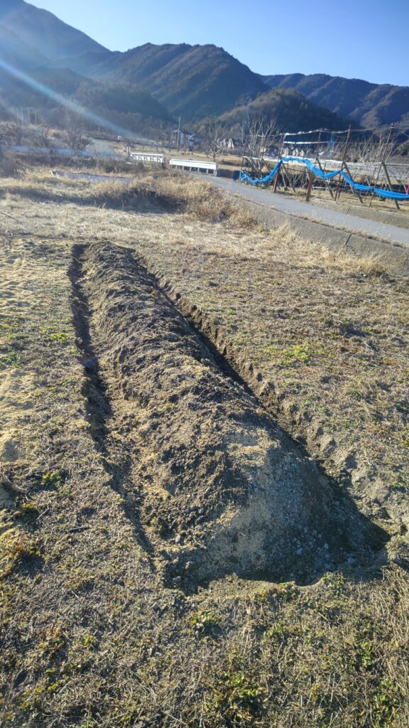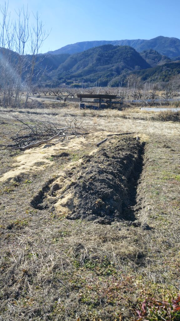 高畝を作るのですが、畝の中には選定した木、竹、籾殻などを埋め、畝の上には枯れ葉、草刈りした時の乾燥した草を畝の上に置いてマルチをかけます。